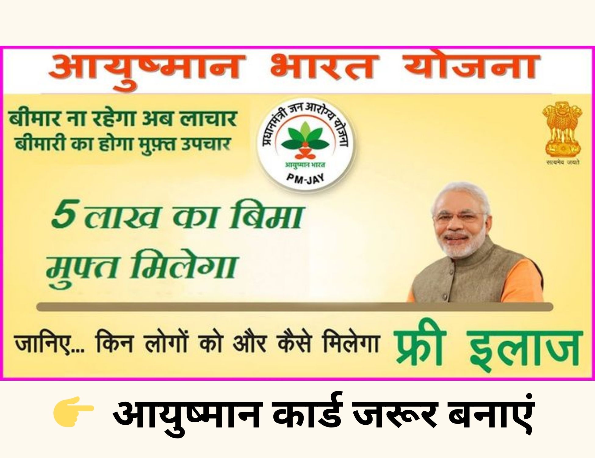 Ayushman Bharat Yojana, जिसे PM-JAY भी कहते हैं, एक स्वास्थ्य बीमा योजना है। ₹5 लाख तक का कैशलेस इलाज इस योजना से प्रत्येक लाभार्थी परिवार को मिलेगा।